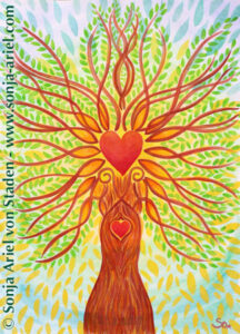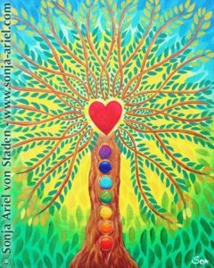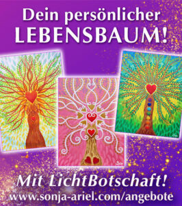 Mitte März erhielt ich eine Vision für einen „LebensBaum der Heilung“ (siehe unten), weil ich diese Kraft gerade selbst dringend brauchte. Als ich ihn malte, kam der Seelen-Auftrag dazu, mehr dieser LebensBäume zu malen und nun sind schon drei inspirierende Bilder mit wunderschönen Botschaften entstanden – siehe links.
